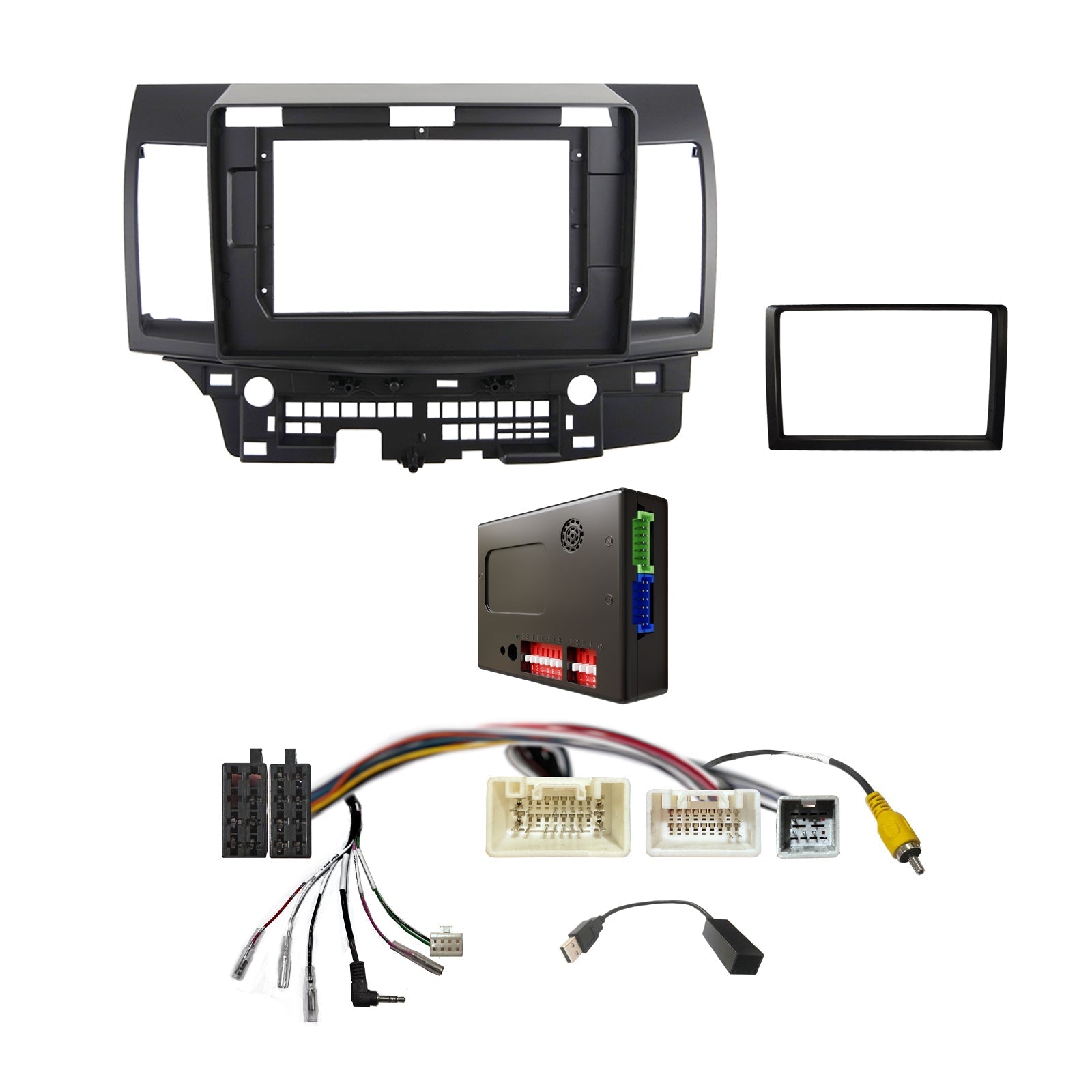 - 9" Fascia with steering wheel control harness, factory camera retention adapter, USB adapter.