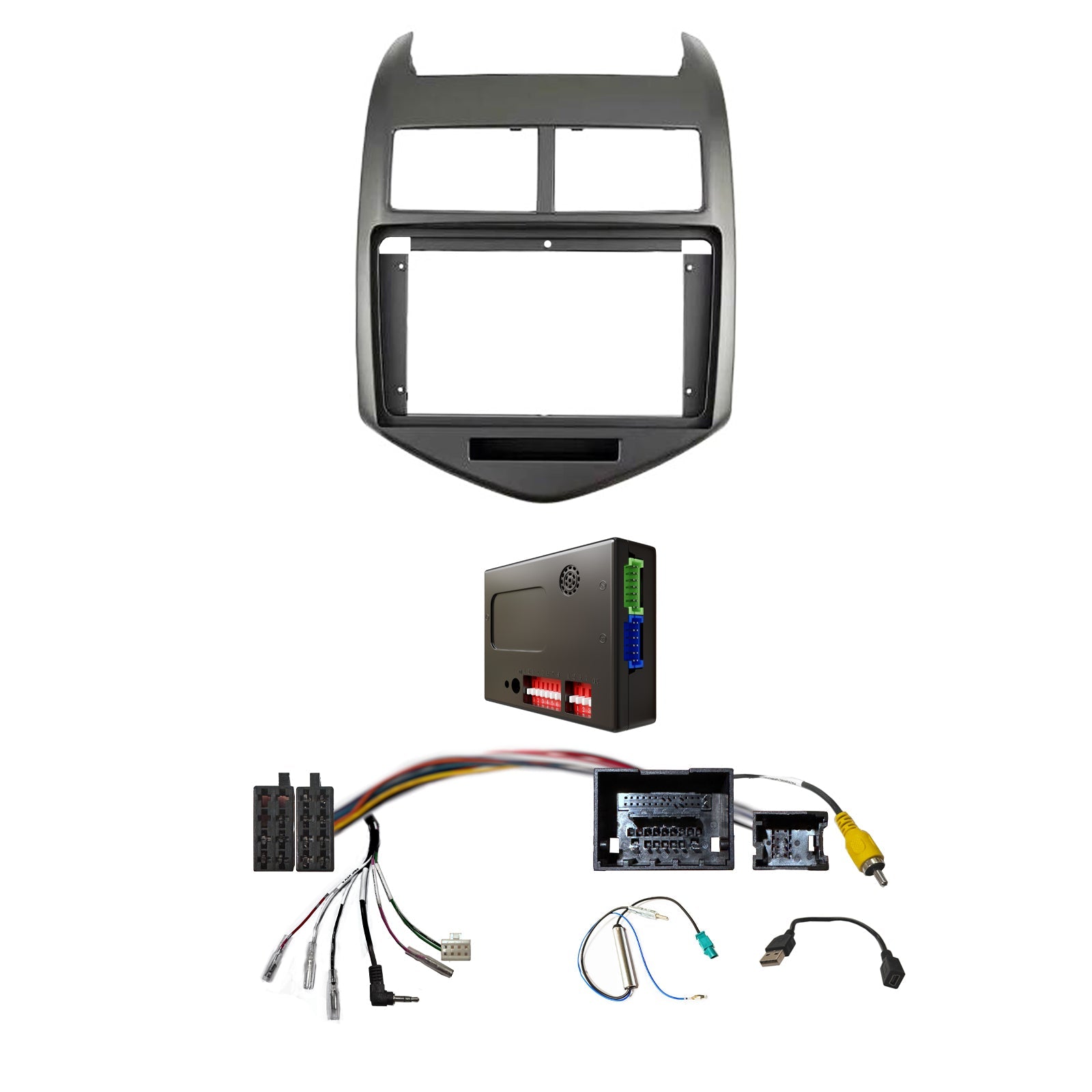 - 9" Fascia with steering wheel control harness, radio antenna, USB adapter.